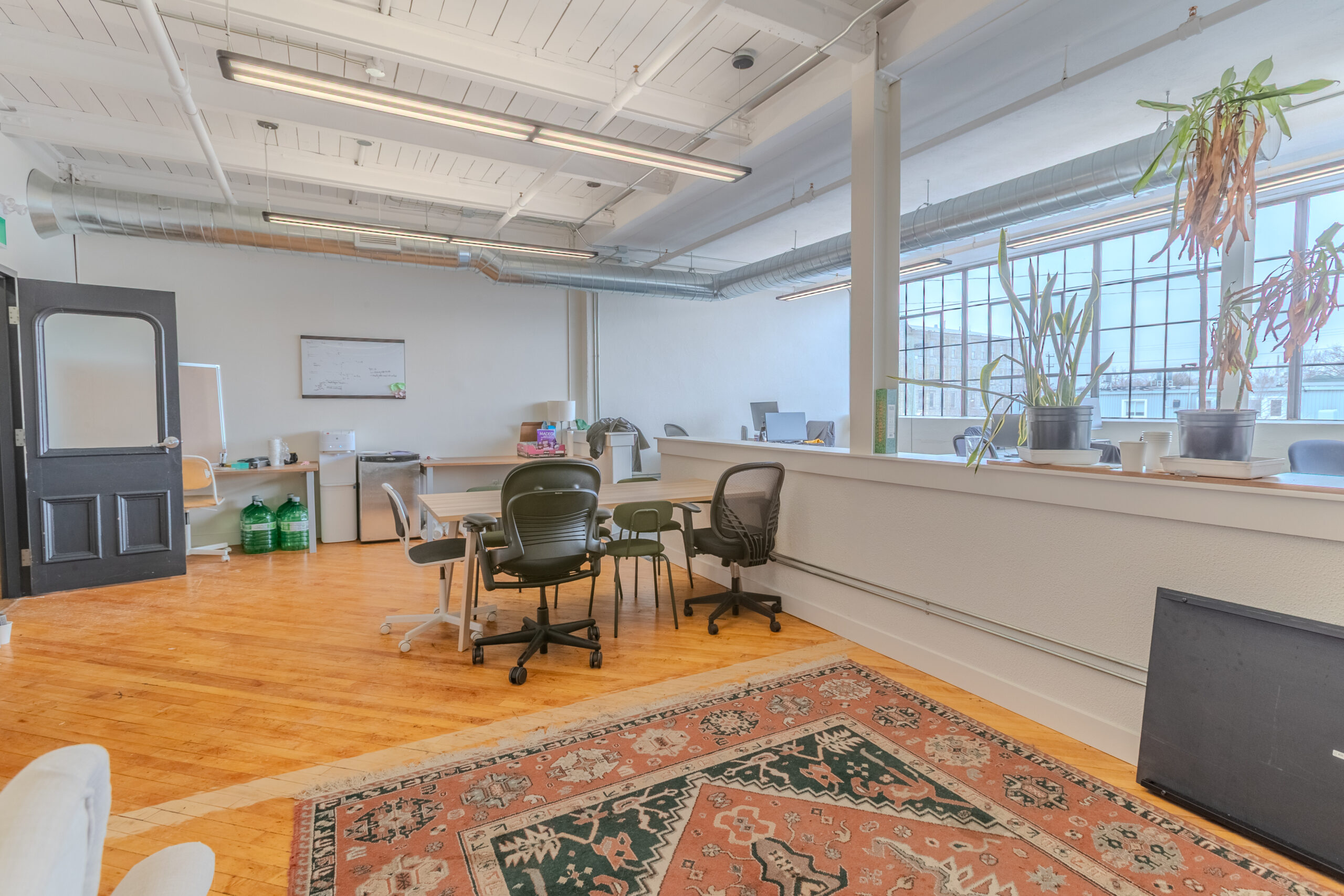 Brick and beam office space for lease with ample natural light and high ceilings located above Smile Tiger Coffee Rosters. Flexible unit sizes ranging from 878 – 2,669 SF.